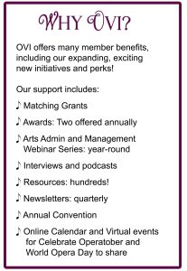 Opera Volunteers International is a nonprofit volunteer organization that advocates for and supports volunteerism in opera throughout North America and beyond. Since 1972, OVI has continued its mission of offering support for individuals, opera companies, schools of music and local opera support organizations through grants, awards, networking, resource databases and education. Ever-expanding, new initiatives are available for our esteemed members throughout North America. Bookmark this page to see the schedule of upcoming events!