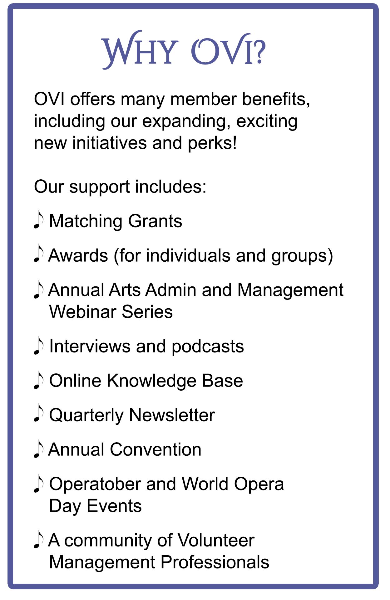 Opera Volunteers International is a nonprofit volunteer organization that advocates for and supports volunteerism in opera throughout North America and beyond. Since 1972, OVI has continued its mission of offering support for individuals, opera companies, schools of music and local opera support organizations through grants, awards, networking, resource databases and education. Ever-expanding, new initiatives are available for our esteemed members throughout North America.